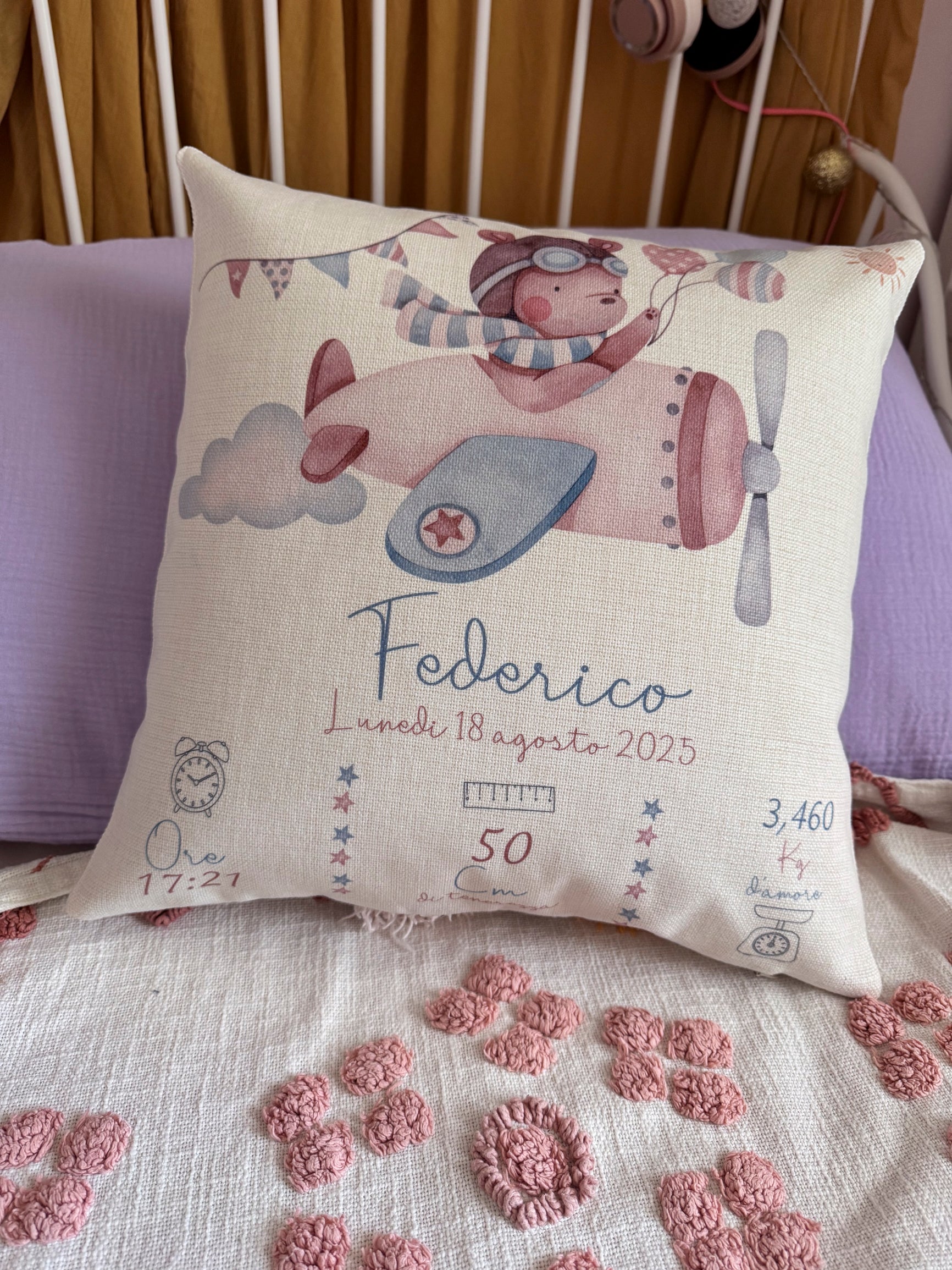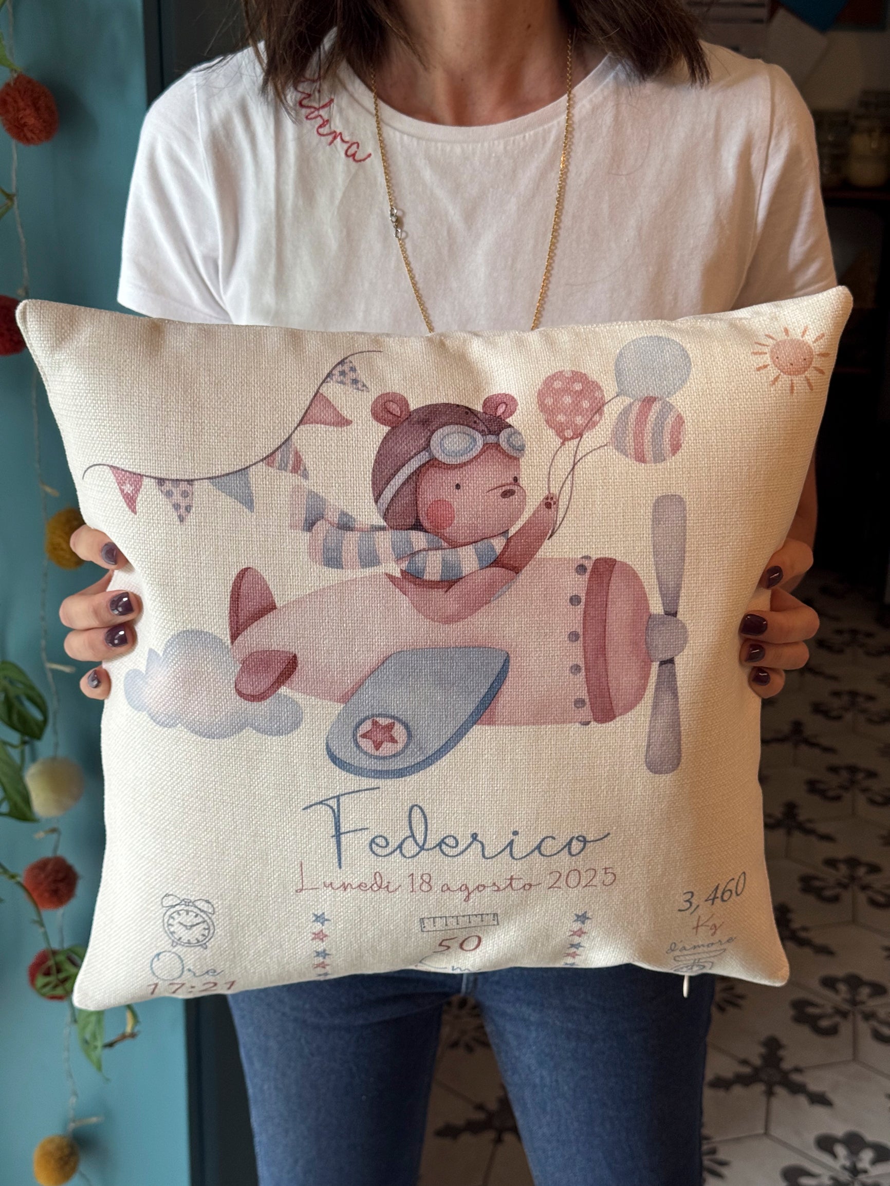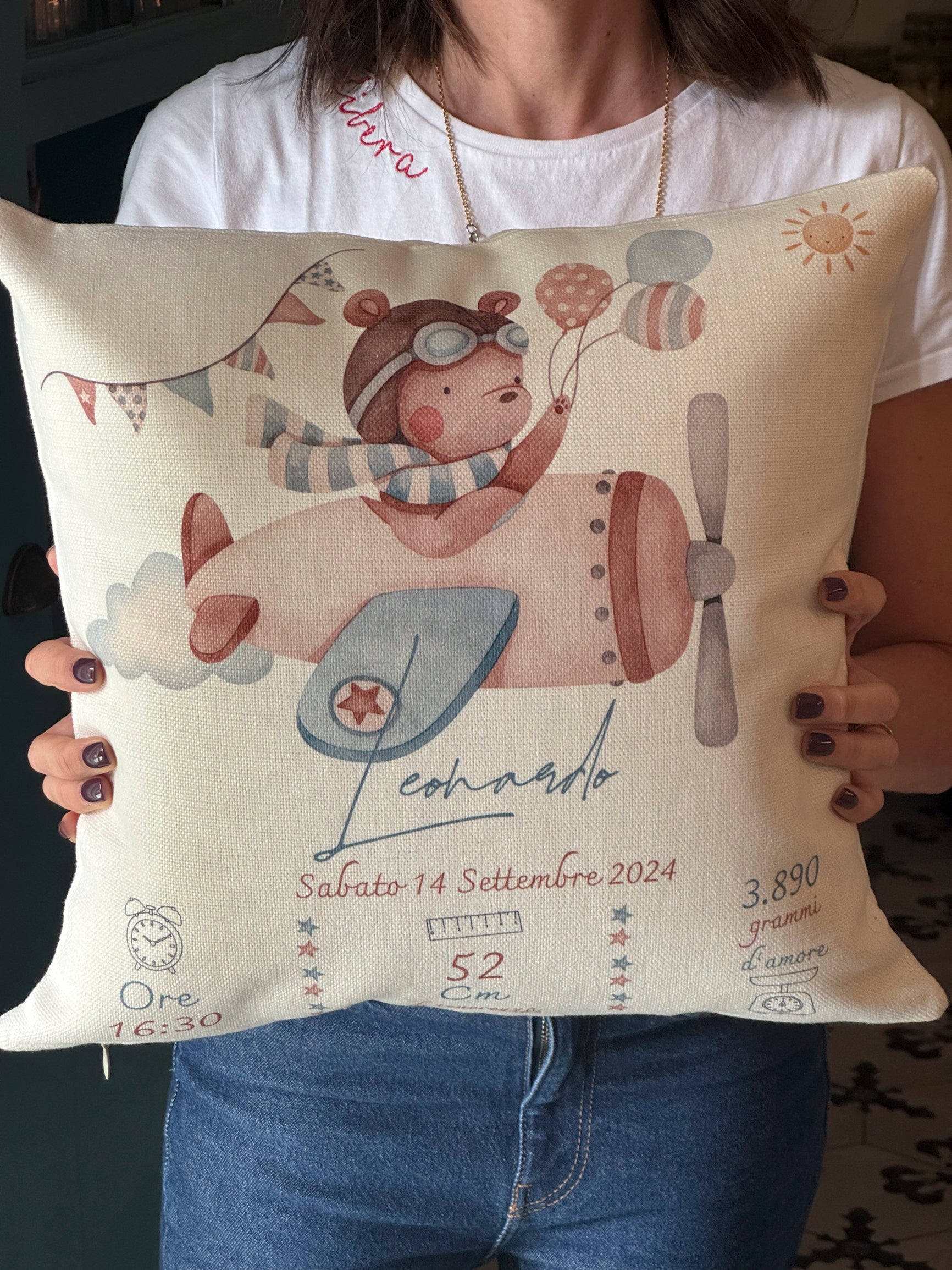 Cuscino Nascita con Orsetto Aviatore personalizzabile con i dati della nascita: