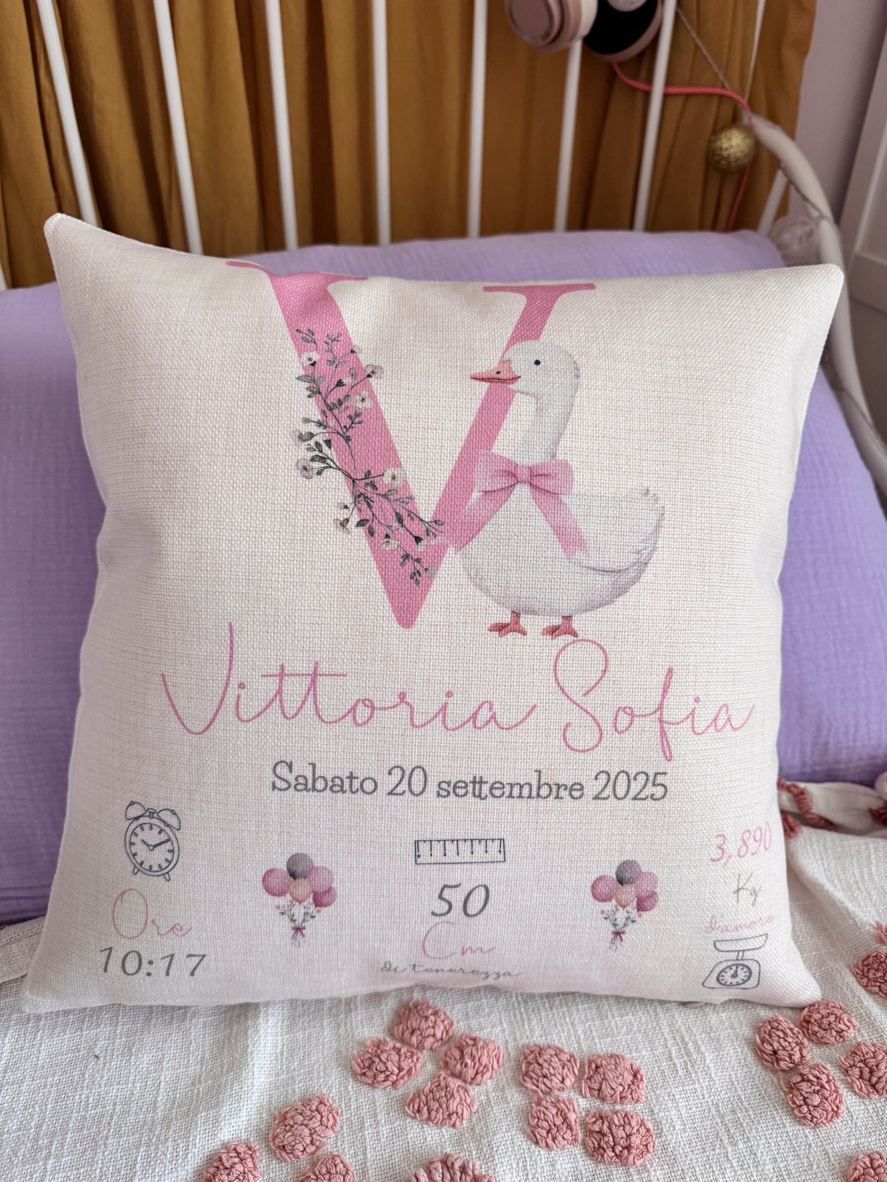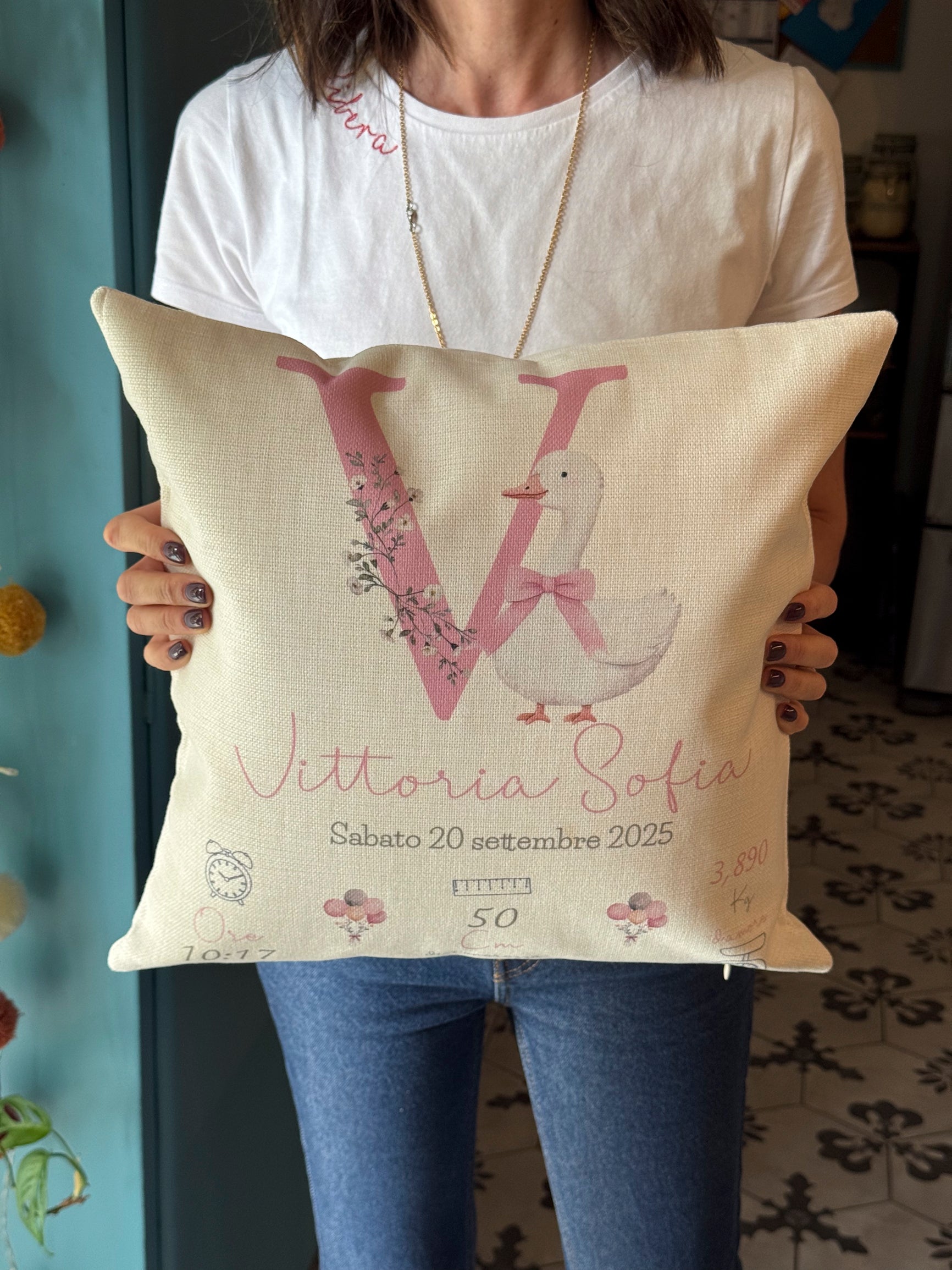 Cuscino Nascita con Paperella e Iniziale del nome personalizzabile con i dati della nascita: